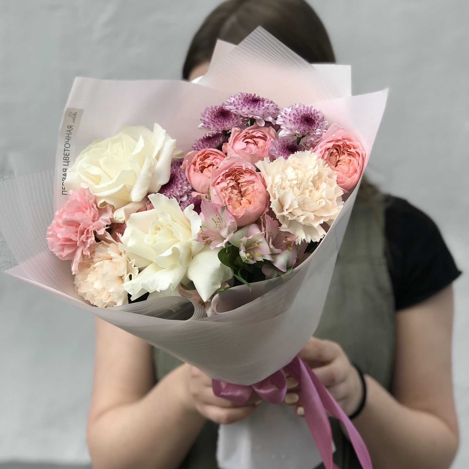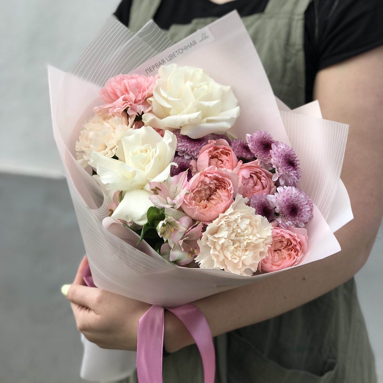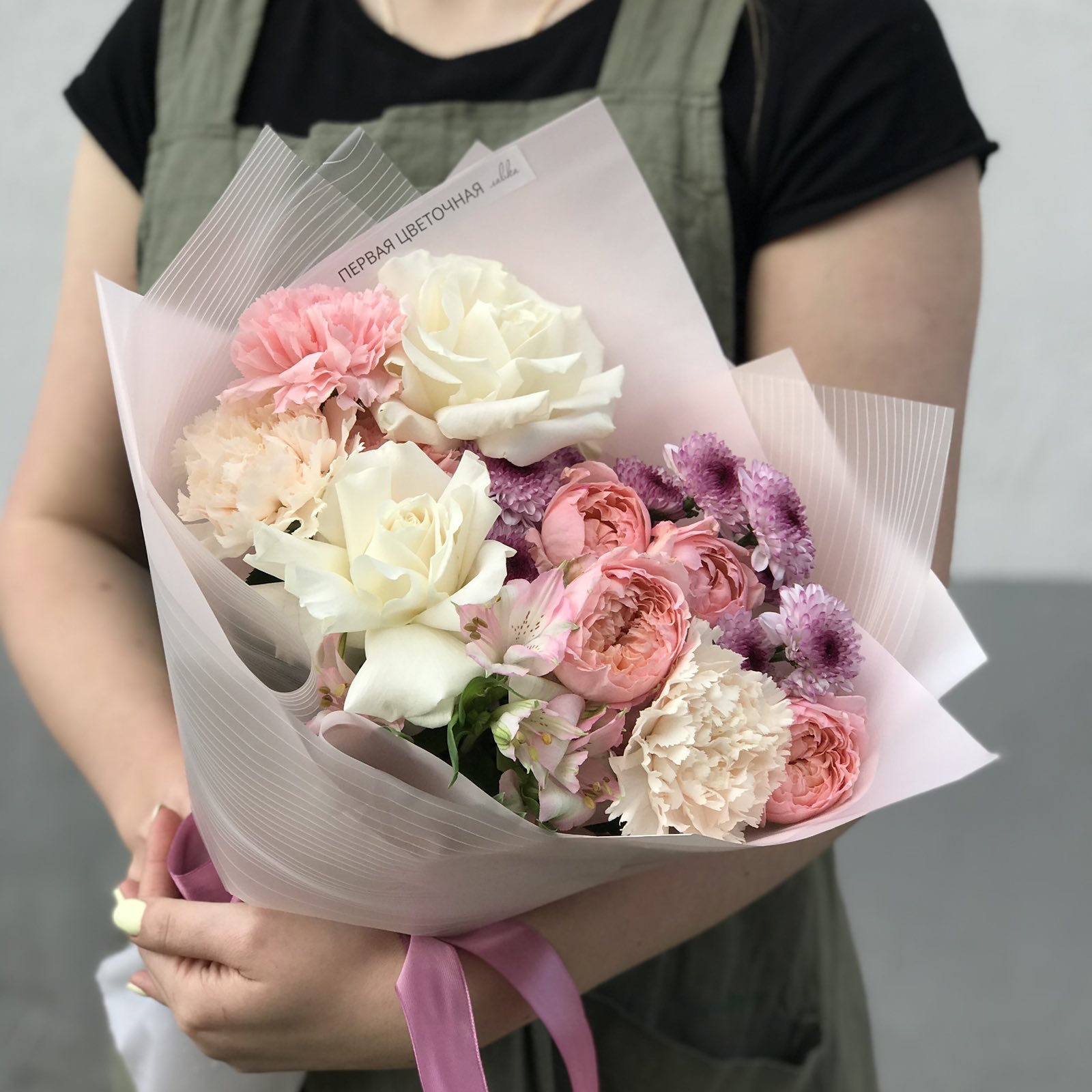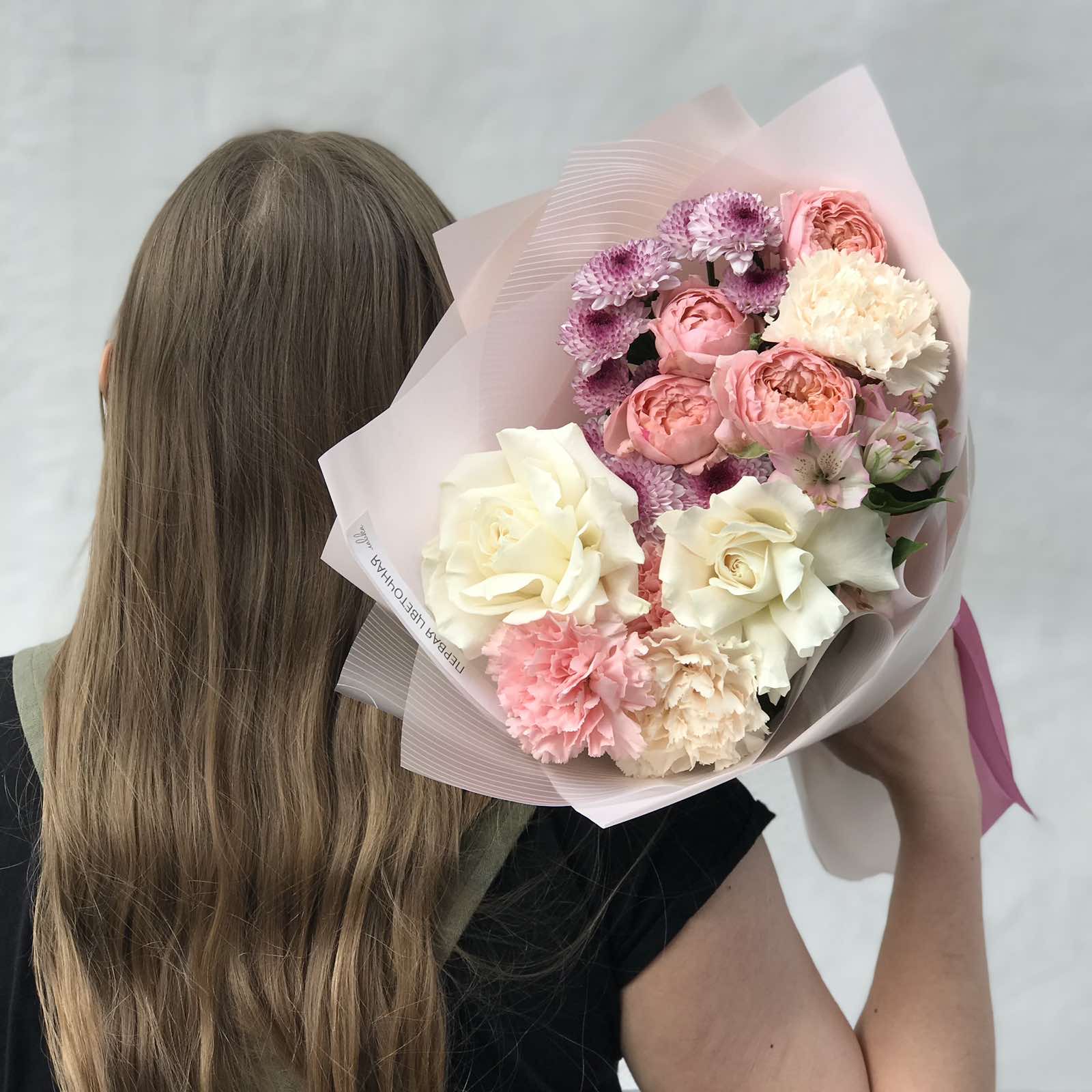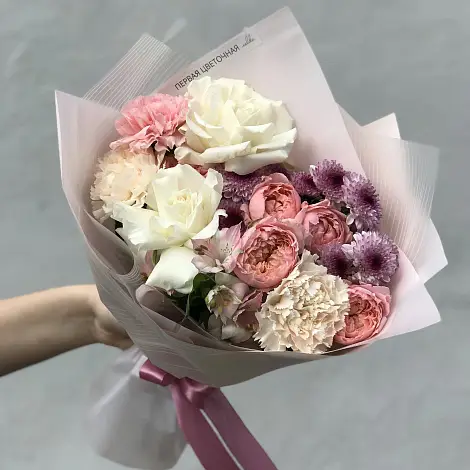 Букет из пионовидных роз, диантусов и хризантем очаровывает своей элегантностью и утонченностью. Французские розы и нежная упаковка также добавляют композиции изысканности и индивидуальности. Вы всегда можете заказать этот букет в понравившейся цветовой гамме, но на другую сумму, немного изменив количество цветов, или изменить цветовую гамму. Просто оформите заказ, а детали обсудите с нашим менеджером.