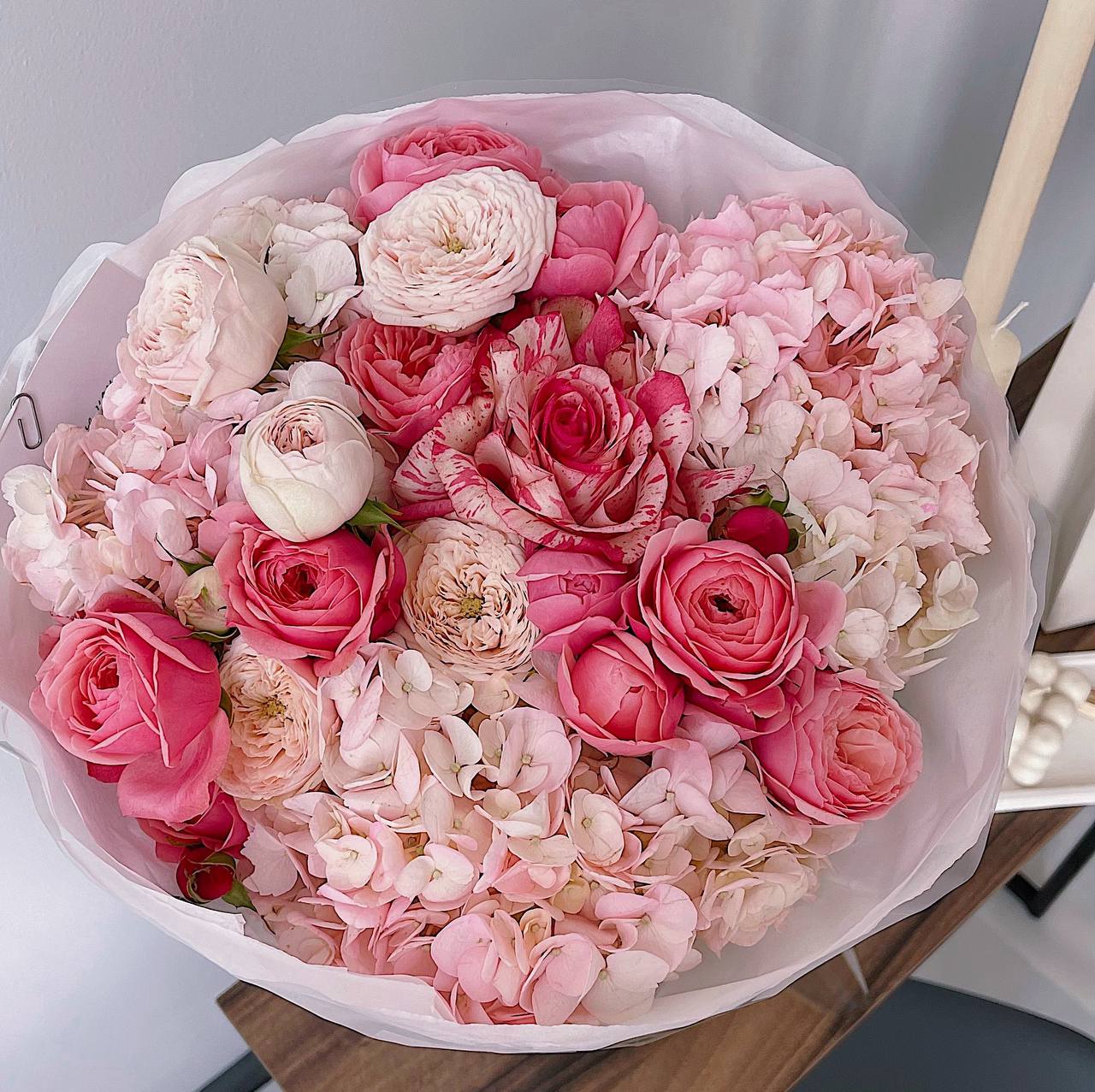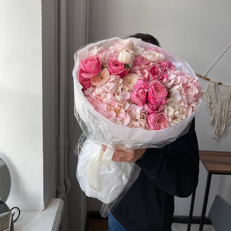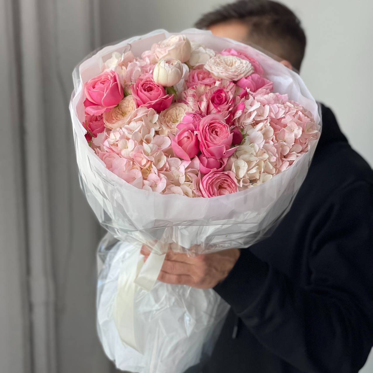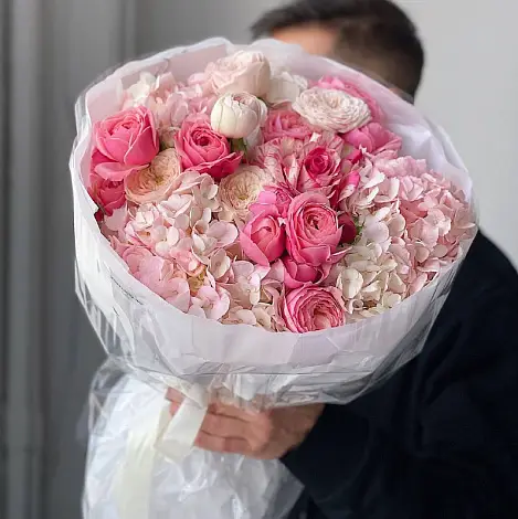Букет из воздушных гортензий и роскошных пионовидных роз станет прекрасным украшением любого праздника или поводом выразить самые теплые чувства близким людям. Вы всегда можете заказать этот букет в понравившейся цветовой гамме, но на другую сумму, немного изменив количество цветов, или изменить цветовую гамму. Просто оформите заказ, а детали обсудите с нашим менеджером.
